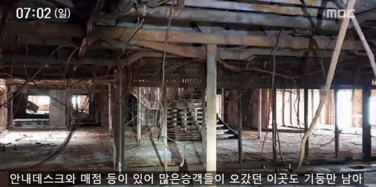 안내 데스크와 매점 등이 있어 많은 승객이 오갔던 이곳에는 기둥만 남아있는 처참한 모습이었다.