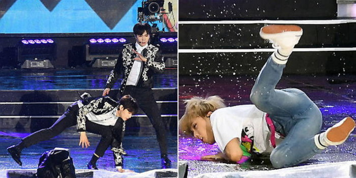 비를 맞으며 거친 안무를 소화한 아이돌들은 미끄러운 무대에서 수차례 위험한 상황을 연출했다.