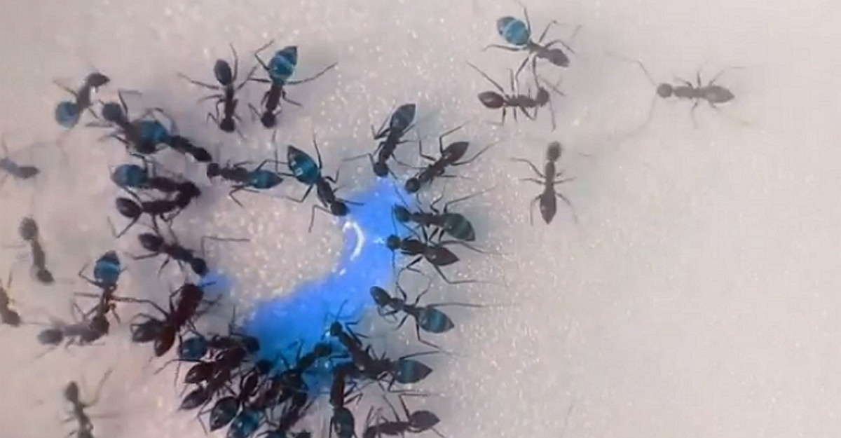 공개된 영상에는 새파란 액체 주변으로 모여든 개미 수십 마리가 보인다.