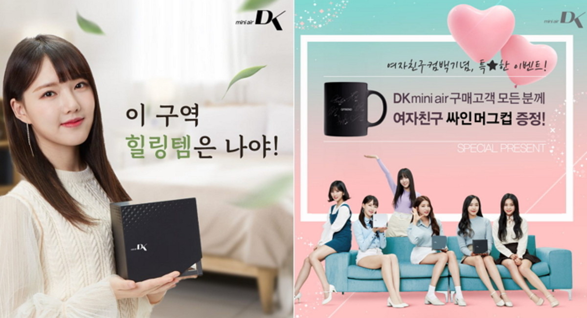 올해 초 DK 공식 광고모델 발탁된 여자친구는 작지만 깨끗한 공기는 물론 맑은 음질을 제공하는 블루투스 스피커 겸 소형공기청정기 'DK 미니에어'의 브랜드 이미지와 부합해 젊은층 사이에 인기몰이를 하는데 크게 기여하고 있다.