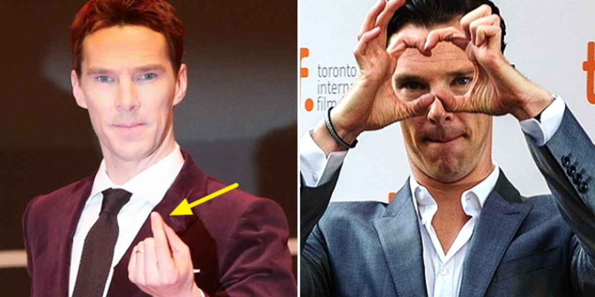 앙증맞게 손가락 하트 포즈를 취하고 있는 컴버배치의 손가락을 유심히 보면 어딘가 이상하다는 것을 눈치챌 수 있다.