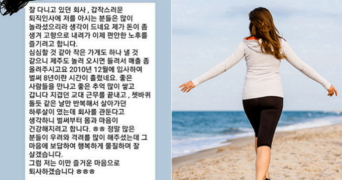 이후 A씨는 동료 3명과 함께 있는 단톡방에 메시지를 남겼다. 그는 "잘 다니던 회사, 갑작스러운 퇴직 인사에 저를 아시는 분들은 많이 놀라셨으리라 생각한다"고 운을 뗐다.