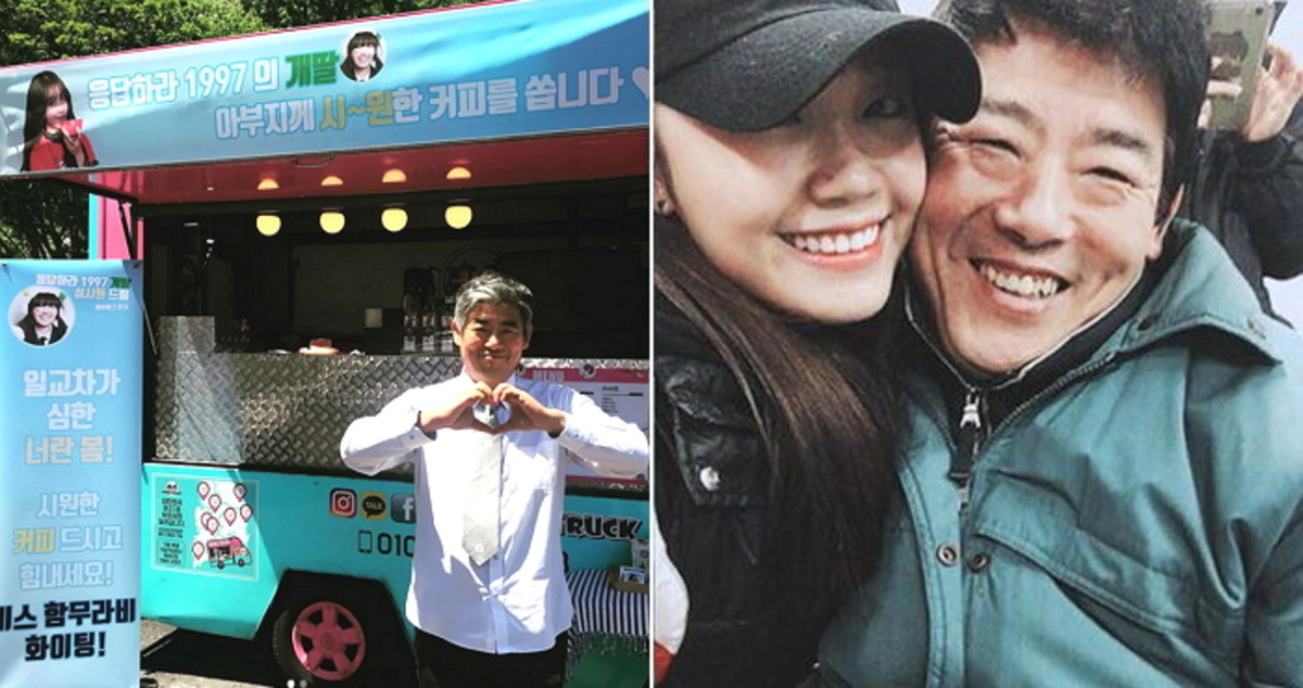 커피차에는 '응답하라 1997의 개딸, 아부지께 시~원한 커피를 쏩니다'라는 현수막이 걸려있다.