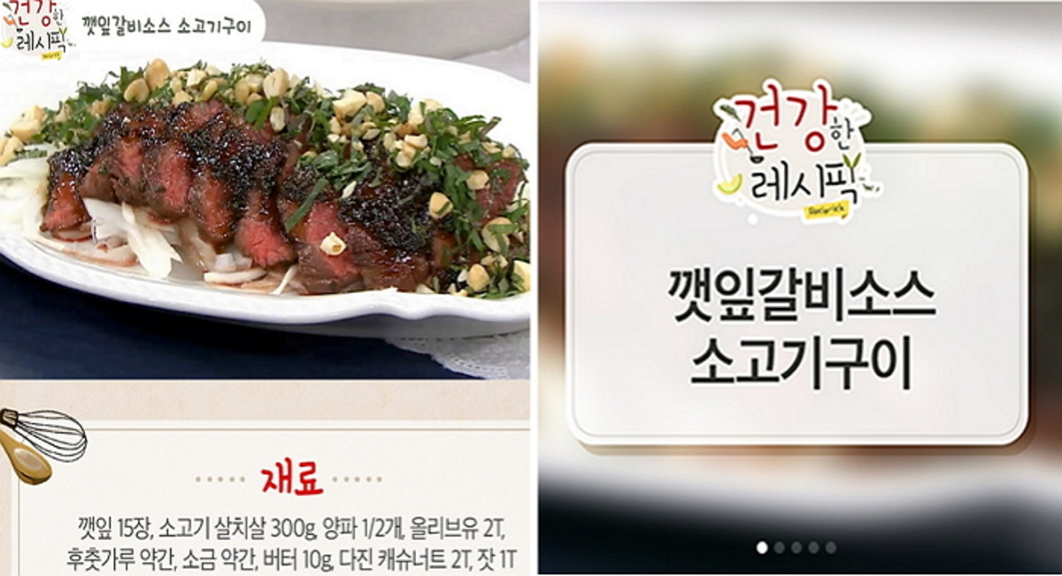 처음으로 공개되는 '건강한 레시픽'은 '깻잎갈비소스 소고기구이'다. 이는 부드러운 소고기 구이에 향긋하고 달콤한 깻잎갈비소스와 캐슈넛, 잣 등 몸에 좋은 견과류를 넣은 음식으로 나른하기 쉬운 봄철에 입맛을 돋운다.
