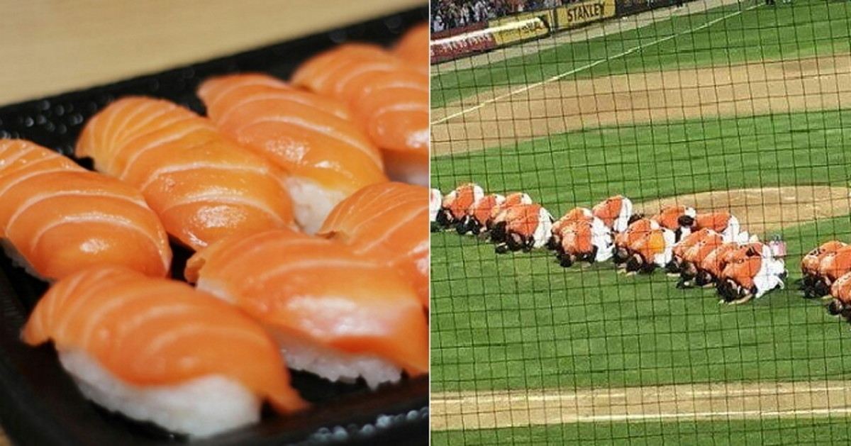 한화 유니폼인 주황색 상의, 흰색 하의가 눈에 띄는데 그 모습이 흡사 '연어초밥'과 닮았다.