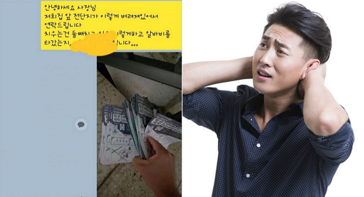 카톡에는 "저희집 앞에 전단지가 버려져 있어서 연락드린다", "치우는 건 둘째치고 일을 이렇게 하고 알바비를 타갔는지"라는 내용이 적혀 있었다.