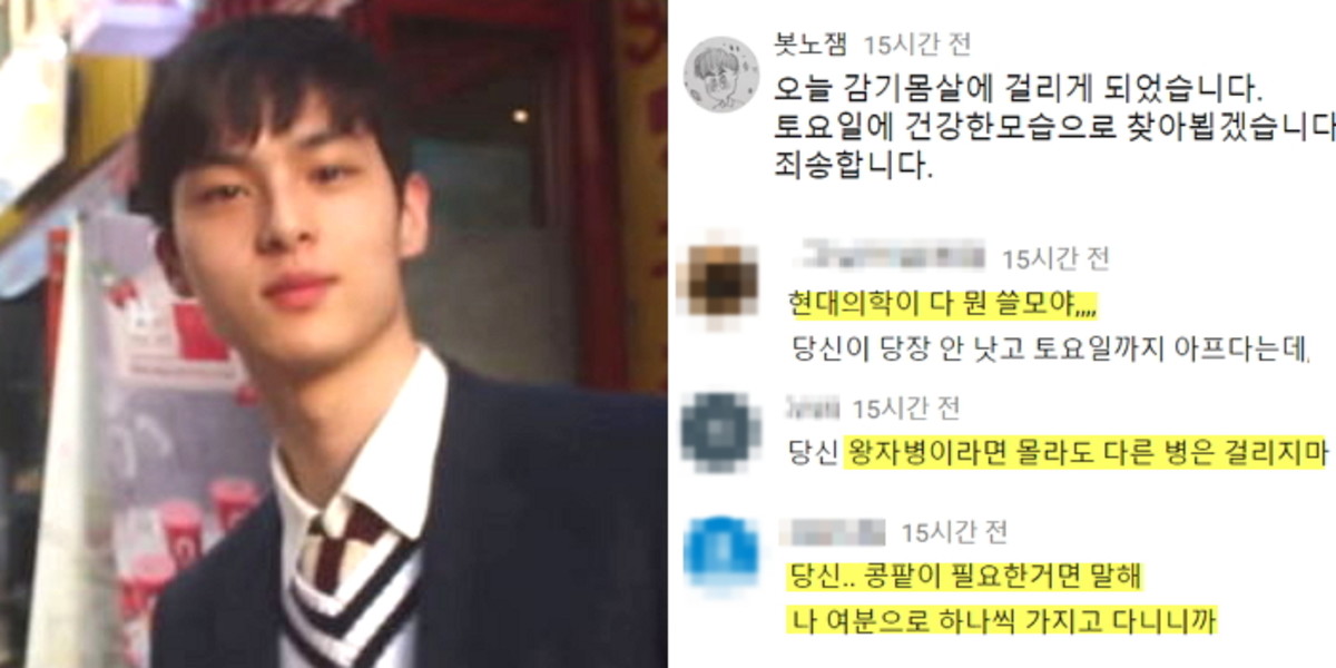 지난 24일 봇노잼은 자신의 유튜브 채널을 통해 "오늘 감기 몸살에 걸렸다. 토요일에 건강한 모습으로 찾아뵙겠다. 죄송하다"고 공지를 띄었다.