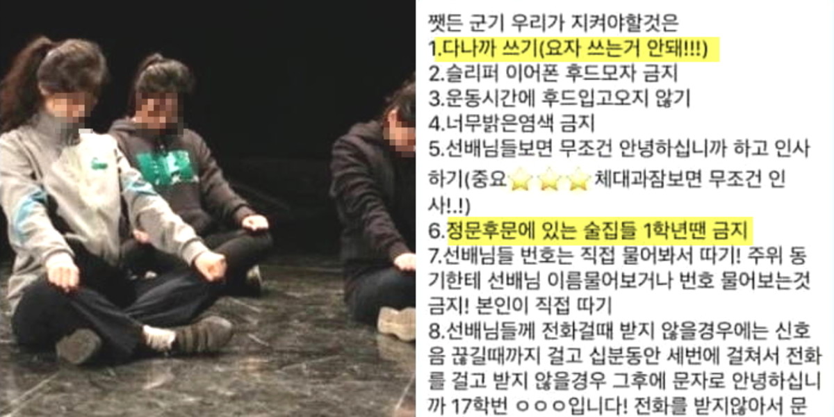 '다나까 쓰기', '너무 밝은 염색 금지'부터 '선배님들을 보면 무조건 안녕하십니까 하고 인사하기' 등 행동 강령은 약과였다.