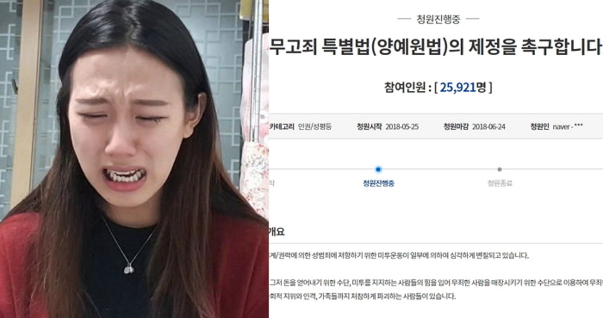 이어 "미투를 그저 돈을 얻어내기 위한 수단, 미투를 지지하는 사람들의 힘을 입어 무죄한 사람을 매장시키기 위한 수단으로 이용하여 무죄한 사람들의 사회적 지위와 인격, 가족들까지 처참하게 파괴하는 사람들이 있다. 이들을 처벌하기 위한 무고죄 특별법의 제정을 촉구한다"고 덧붙였다.
