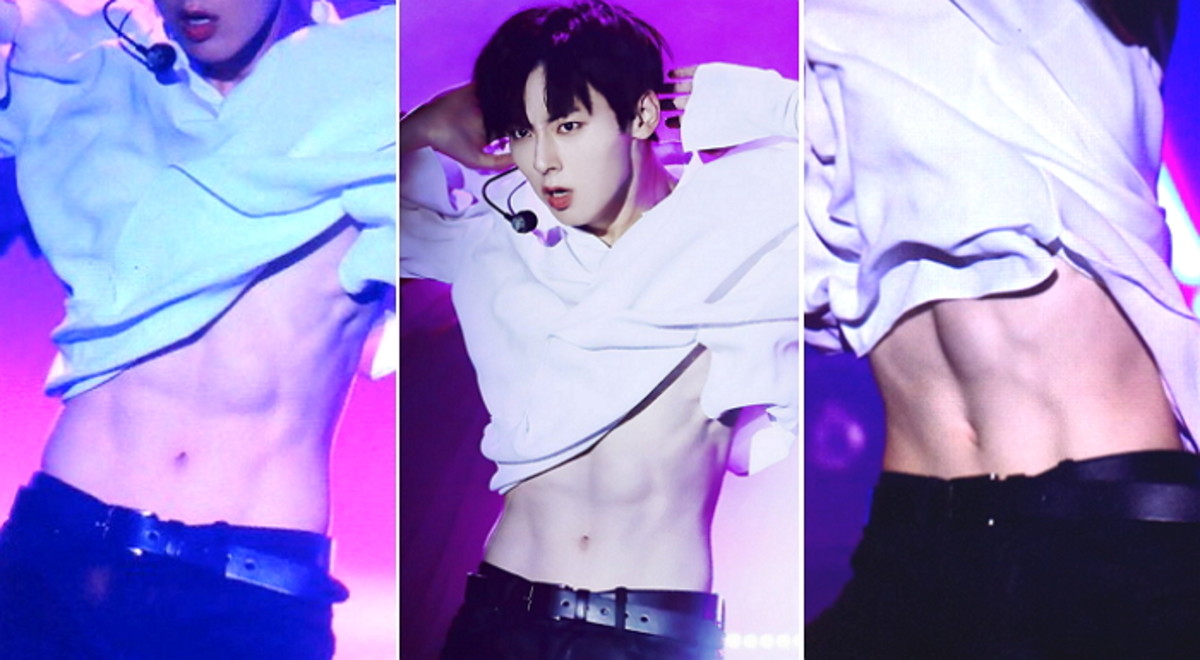 황민현은 이날 손을 뻗거나 점프를 하는 등 파워풀한 안무마다 셔츠가 말려 올라갔고 이와 함께 선명한 복근이 공개됐다.