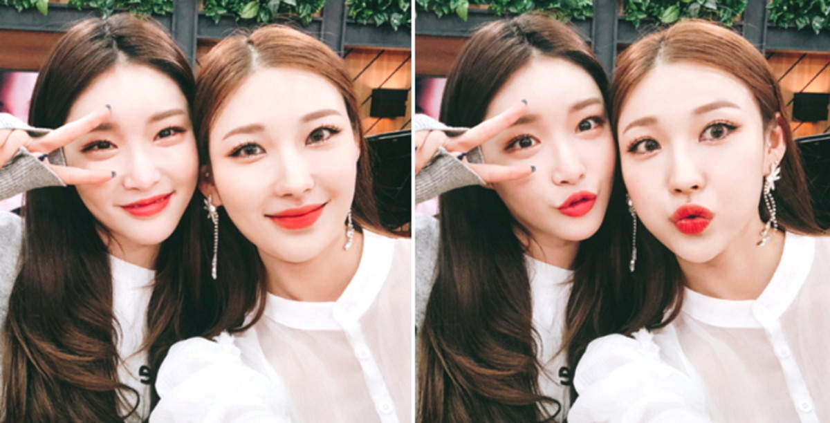 사진 속 청하와 이사배는 비슷한 웨이브 헤어스타일에 얇은 눈썹, 진한 눈화장을 하고 있다.