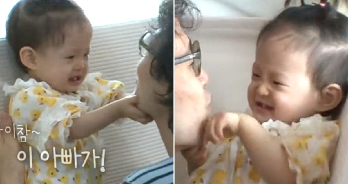 조정치가 입술을 내밀고 계속 뽀뽀를 해달라고 하자 은이는 부담스러운 듯 아빠의 턱을 양손으로 잡고 있는 힘껏 밀어냈다.