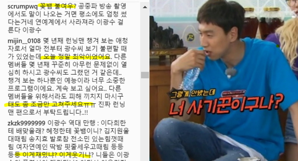 이광수의 SNS에 항의 댓글을 단 이들은 "아무리 예능이지만 최소한의 예의는 있어야 하지 않느냐", "처음에는 재밌었지만 점점 정도가 심해지는 것 같다"는 의견을 보였다.