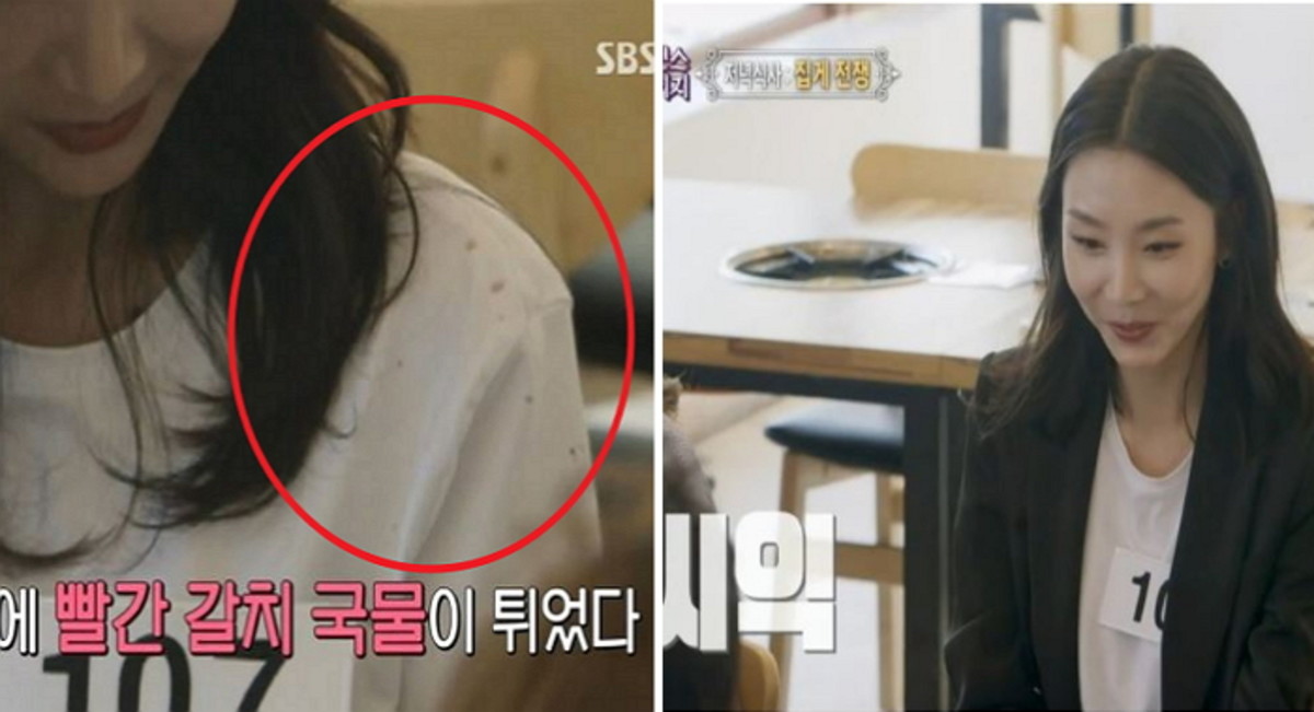 하얀 티셔츠를 입은 107호의 어깨 쪽이 빨간 갈치 국물로 범벅이 됐고 당황한 102호는 "죄송하다"고 사과하며 어쩔 줄 몰라 했다.