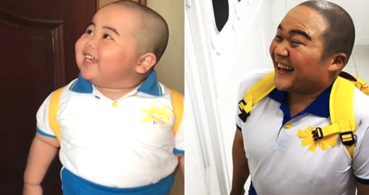 어린아이와 똑같이 흰 티, 파란 면바지를 입고 노란 가방을 멘 차림의 조세호는 민머리 분장까지 완벽히 소화했다.