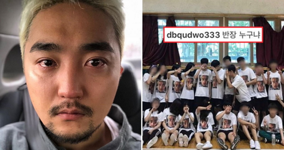 사진 속 학생들은 유병재의 눈물 셀카가 크게 프린트된 반팔 티셔츠를 입은 채 단체로 사진을 찍었다.