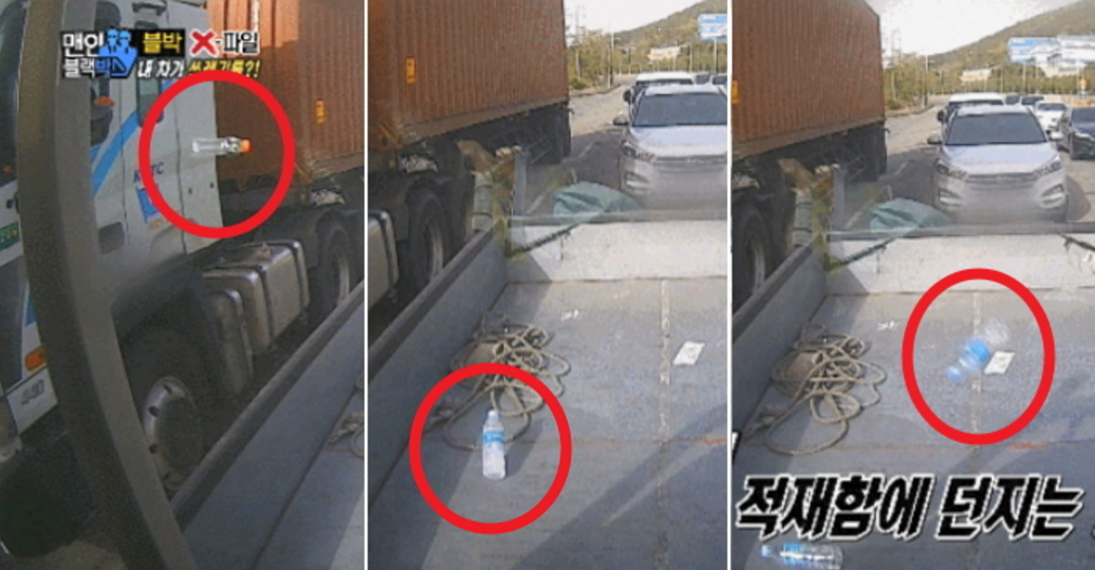 지난 2일 SBS '맨 인 블랙박스'는 신호 대기 중이던 화물차 운전자 A씨가 옆 트럭 화물칸에 다 먹은 물병들을 투척하는 영상을 소개했다.