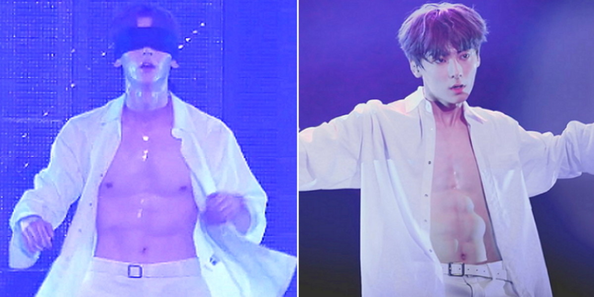 황민현은 춤을 추기 시작하면서 셔츠의 단추를 풀어 선명한 복근을 공개했다.
