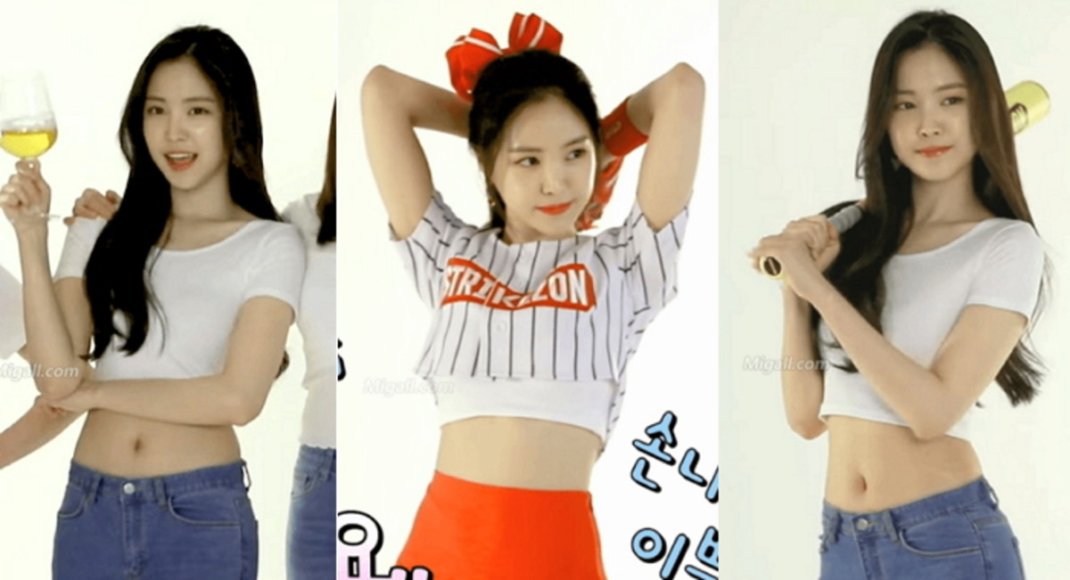 에이핑크 멤버들과 함께 한 스크린 야구장 브랜드 광고를 촬영하고 있는 손나은은 흰색 크롭티에 다리 라인을 강조하는 청 스키니진을 입었다.