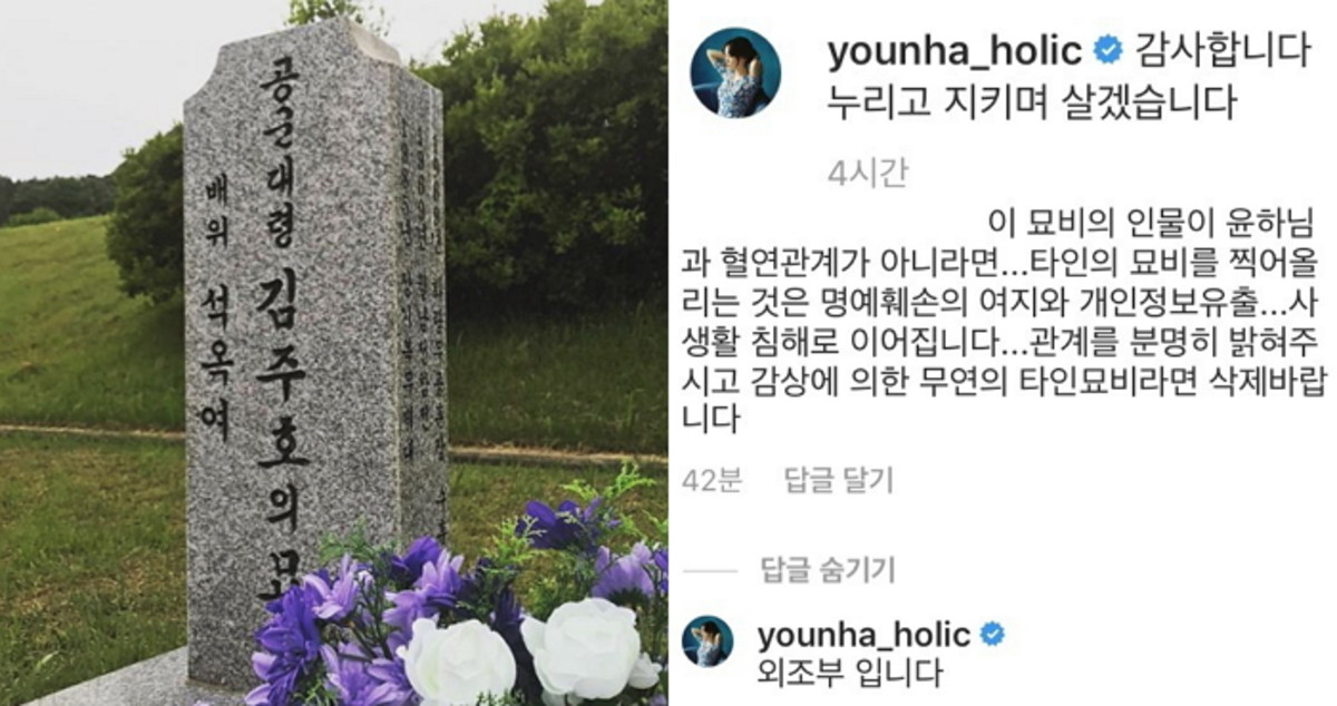윤하의 해명이 달린 뒤 묘비 사진을 지적한 누리꾼은 "외조부님의 생애에 대한 사전지식이 없어 오해가 있었다"며 "훌륭하신 외조부님께 존경을 표한다. 나도 감사드리는 마음으로 살겠다"고 밝혔다.