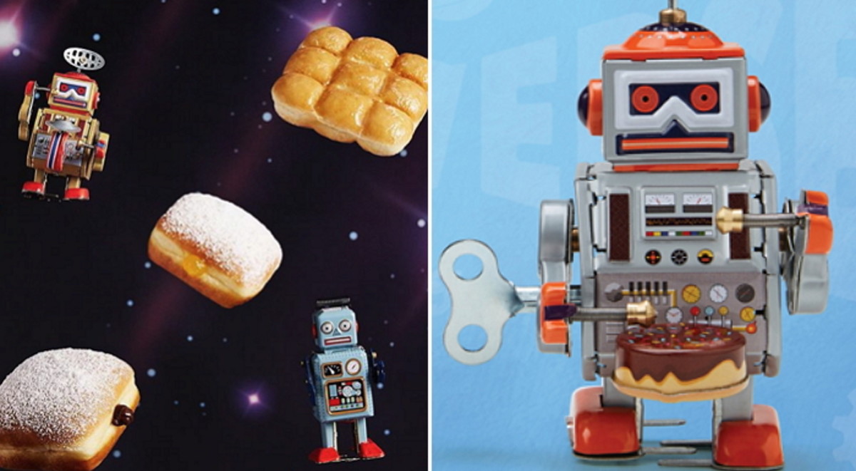 귀여운 로봇 모양의 던킨 틴토이는 태엽 장치를 이용한 빈티지 인테리어 소품으로, 감각적인 디자인을 자랑한다.
