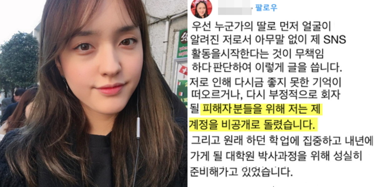 그는 "우선 누군가의 딸로 먼저 얼굴이 알려진 저로서 아무 말없이 제 SNS 활동을 시작한다는 것이 무책임하다고 판단하여 이렇게 글을 쓴다"라며 조심스럽게 입을 열었다.