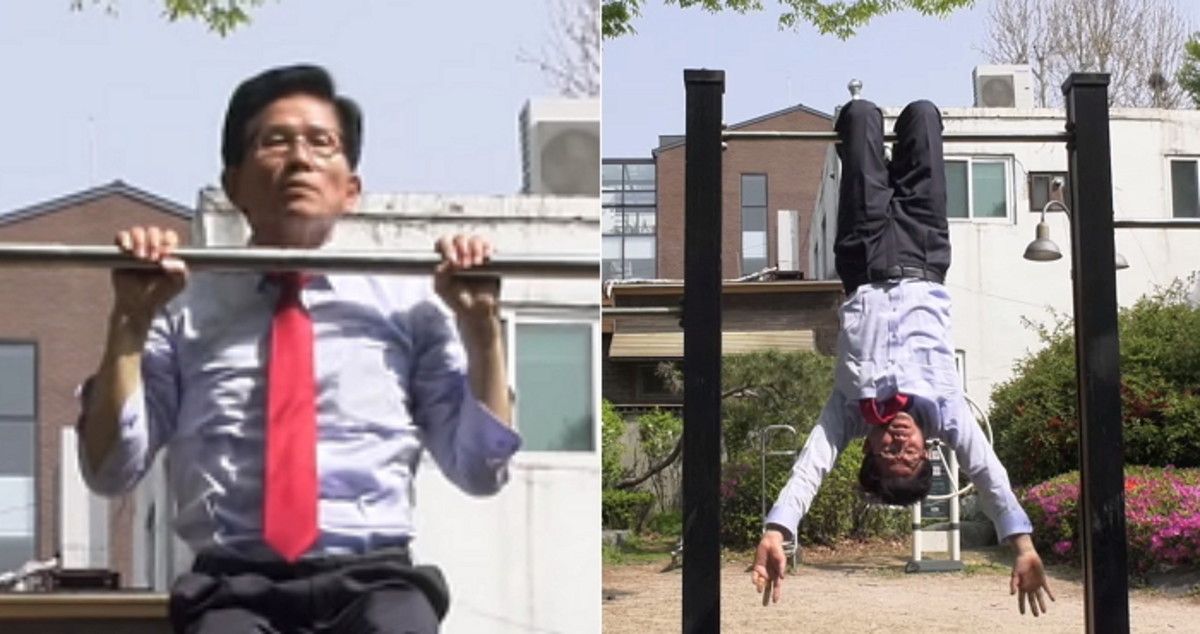 턱걸이에 이어 다리를 이용해 철봉에 거꾸로 매달리는 고난도 동작도 선보인 김 후보는 카메라를 보며 양팔을 흔드는 여유로움도 보여준다.