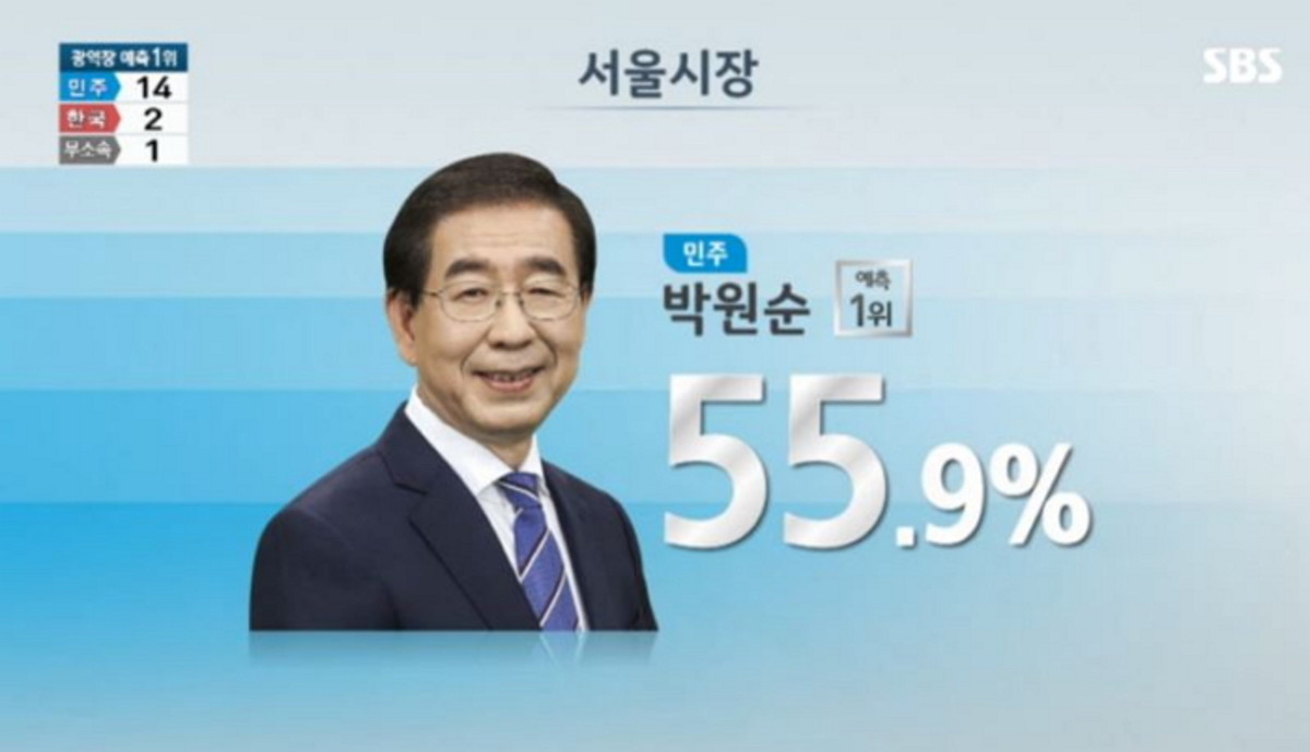SBS 출구조사 결과에 따르면 더불어민주당 서울시장 후보로 출마한 박원순 현 서울시장이 55.9%로 당선될 것으로 예측됐다.