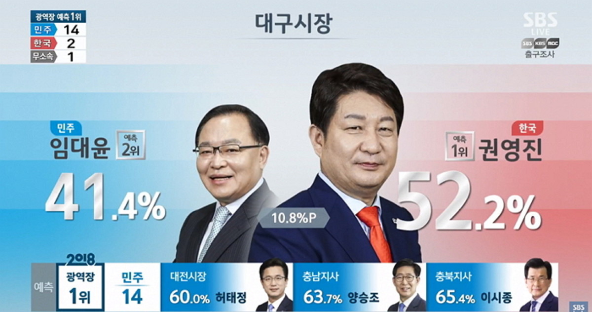 SBS 출구조사에 따르면 최대 격전지로 불려진 대구시장 선거에서 자유한국당 권영진 후보는 52.2%로 예측 1위를 차지했다.