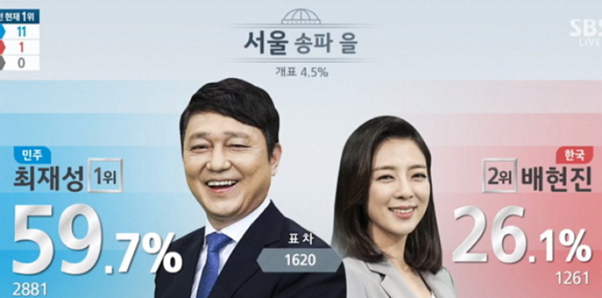 한편 자유한국당의 히든카드였던 배현진은 26.1%의 득표율로 2위에 머물렀다.