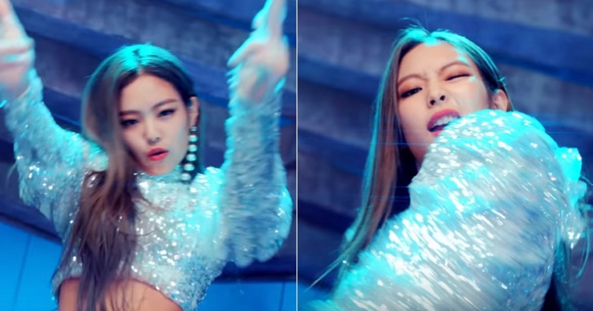 제니는 반짝이는 크롭티를 입고 등장해 총을 쏘는 듯한 강렬한 안무를 보여줬다.