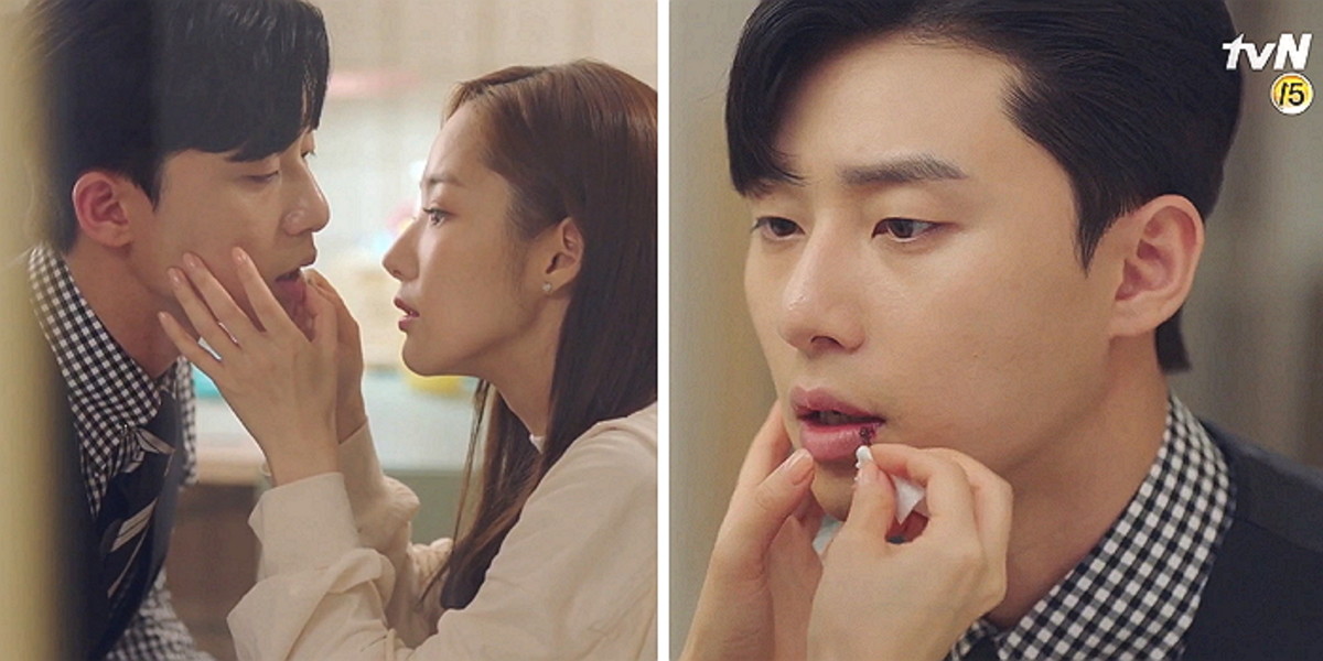 지난 14일 방송된 tvN '김비서가 왜 그럴까'에서는 비서 김미소(박민영 분)가 자신이 모시는 유명그룹 부회장 이영준(박서준 분)의 입술 상처를 치료해주는 장면이 그려졌다.