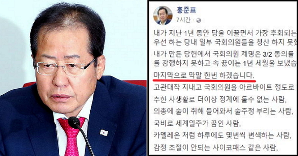 홍 전 대표는 16일 자신의 페이스북에 "마지막 막말하겠다"라는 글을 올리며 자신이 지난 1년 동안 당 대표를 하면서 느낀 속마음을 밝혔다.