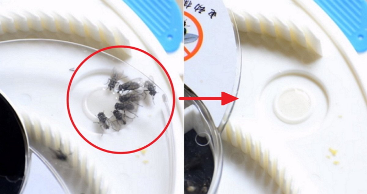 옹기종기 모여 단물을 빨아먹는 파리들은 자신도 모르는 사이 아래의 통에 갇히게 된다. 나중에 통을 분리해 버리기만 하면 끝이다.