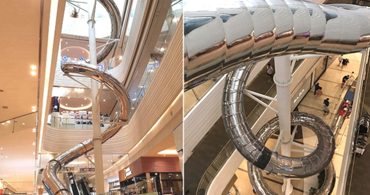 워터파크에서나 볼법한 은색 튜브 모양의 자이언트 슬라이드는 고객들을 4층에서 1층으로 순식간에 이동시켜 준다.