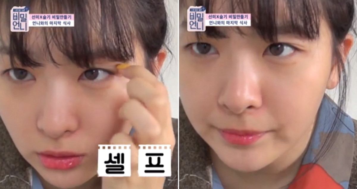 슬기와 선미는 카메라를 보며 쌍꺼풀 만들기에 도전했다.