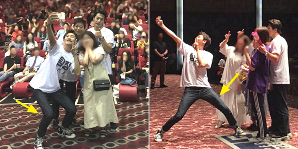 190cm에 달하는 큰 키 탓에, 팬들과 한 프레임에 담기기 위해 최대한 자세를 낮추려던 것.