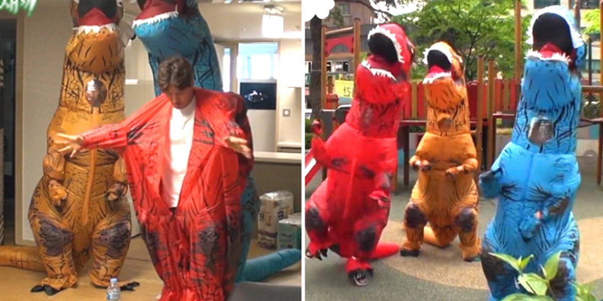 세 사람은 연습을 끝낸 후 놀이터로 향했고, 공룡 코스프레한 이들 주변으로 금세 아이들이 몰려들었다.