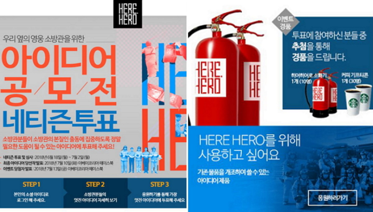 투표에 참여한 이들에게는 추첨을 통해 10명에게 '히어히어로'가 브랜딩 된 소화기를, 30명에게 커피 기프티콘을 증정한다.