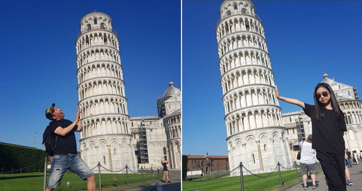 공개된 사진에는 박명수와 딸 민서 양이 이탈리아 피사의 사탑 앞에서 원근감을 이용해 재미있는 자세를 취한 모습이 담겨있다.