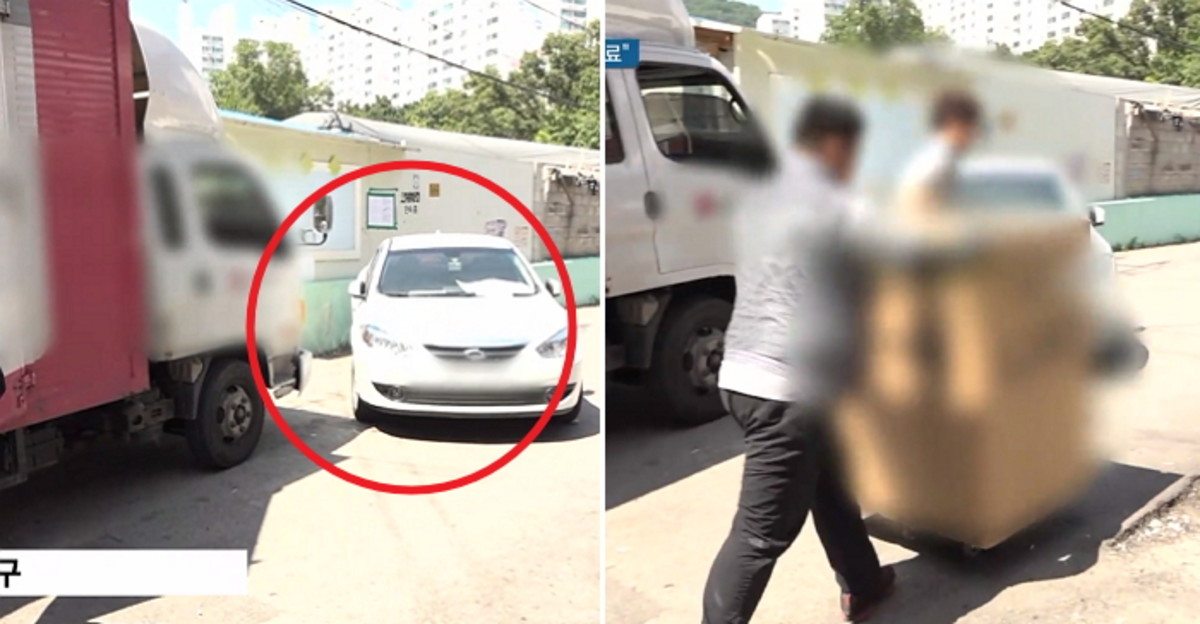 보통 가전제품은 사다리차를 이용해 배달하지만, 집 앞을 막아선 승용차 때문에 택배기사들은 무거운 상자를 끌차에 실어 계단으로 날라야 했다.