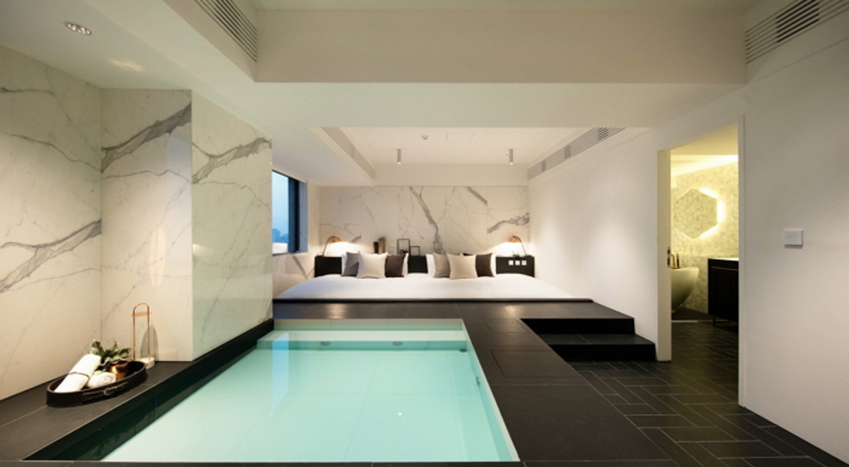파티를 위한 객실은 거실과 침실이 분리된 글래드 하우스 또는 따뜻한 색감의 대리석과 핑크 컬러 인테리어에 실내 수영장까지 있다.