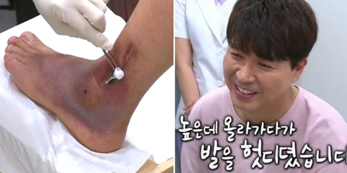 박수홍의 다리 '깁스'를 걷어내자 검붉은 피부가 나왔다.