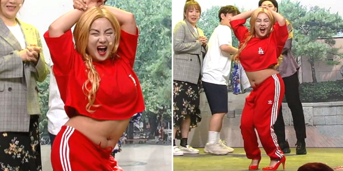 이날 박나래는 오동통한 복부가 훤히 노출되는 빨간색 트레이닝 복 차림으로 등장했다.