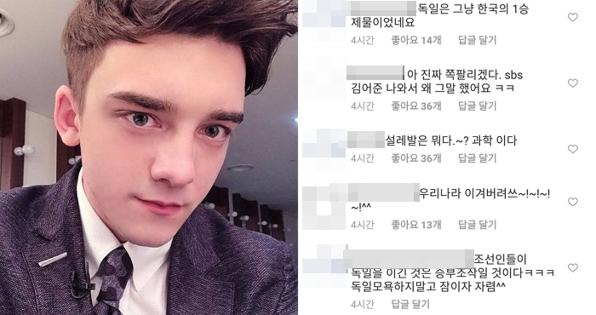 유독 닉의 인스타그램에 악성 댓글이 많이 달린 이유는 그가 과거 방송에서 독일의 승리를 자신만만하게 예측했기 때문인 것으로 보인다.