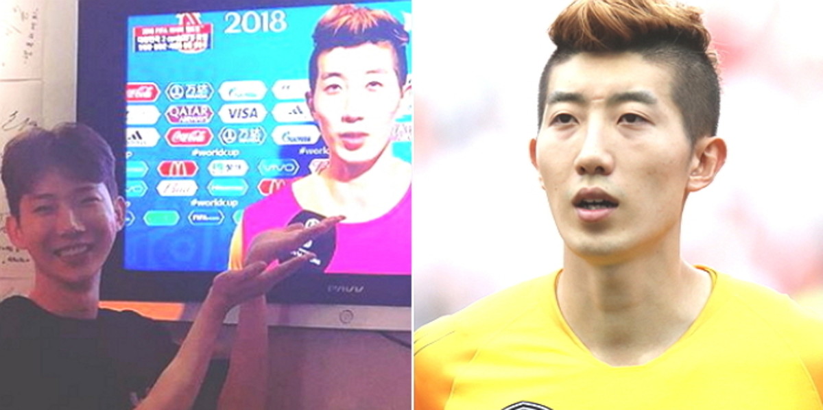 공개된 게시물 속 조권은 골키퍼 조현우가 인터뷰하고 있는 텔레비전 앞에서 사진 촬영을 했다.