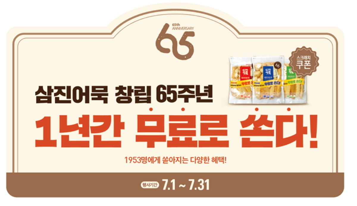 삼진어묵 창립 65주년 이벤트는 '1년간 무료로 쏜다! 스크래치 이벤트', '인기 어묵 5종 할인 이벤트' 등으로 마련됐다.