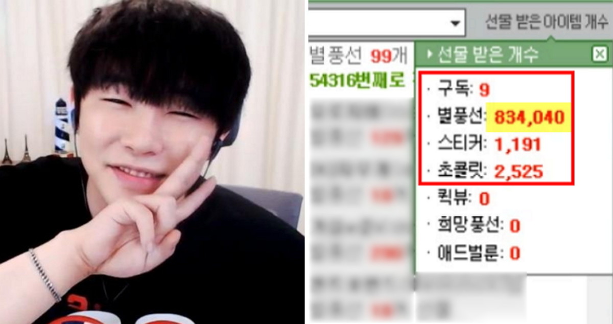 오후 3시 40분 기준 받은 총 별풍선 개수가 83만4040개였다고 한다. 별풍선 1개당 100원이라는 점을 고려하면 케이가 번 돈은 8340만 4천원이다.