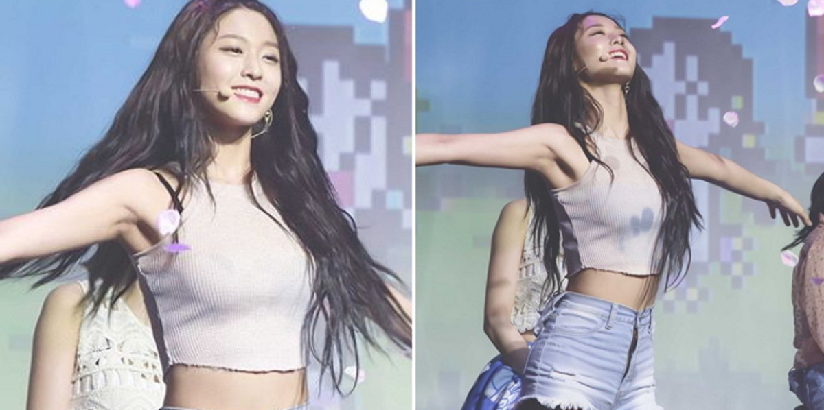 사진 속 설현은 AOA 멤버들과 함께 무대에서 행복한 미소를 짓고 있다.