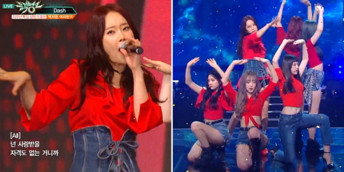 진한 빨간색 상의와 청바지로 스타일링을 맞춘 여자친구와 백지영은 먼저 노래 '대시'를 열창했다.